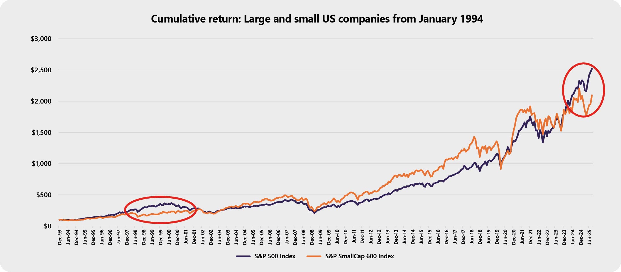 It might come as a surprise to see that, apart from the two periods highlighted in red, the cumulative return of small US companies has generally been superior to large US companies (including the high-profile mega cap companies referred to earlier).
